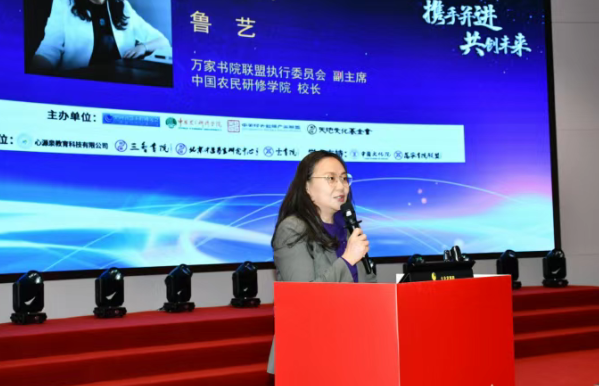 万家书院联盟执行委员会副主席、中国农民研修学院校长鲁艺致词,“强学业·稳就业·促创业,多年来中国农民研修学院一直响应中共中央关于制定国民经济和社会发展的建议:加快构建中国哲学社会科学自主知识体系。”