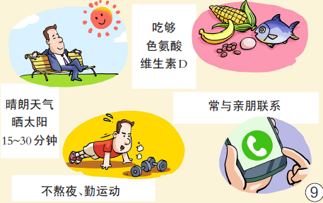图9:应对冬季抑郁,要勤晒太阳、多吃富含色氨酸和维生素D的食物,规律作息、经常锻炼,保持社交互动。